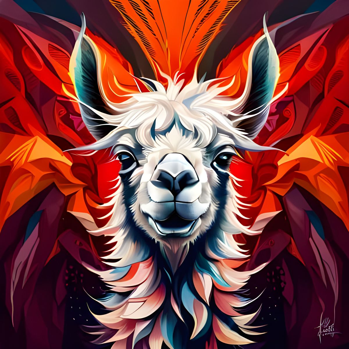 A striking picture of a screaming llama portrait with detailed feathers set against a fiery backdrop. This hyperrealistic digital artwork features intricate details and intense color depth.