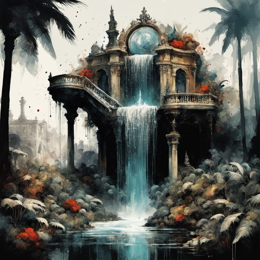 huge concrete palms held together, scooping water, meant as a garden sculpture, a water-feature in a garden, water flowing out of them. Double exposure, dual exposure!! Front view :: Old treasure chest exploding with gems, jewells and jewellery sparkling + SILHOUETTE treasure chest!! Intricate, hyperdetailed, ...