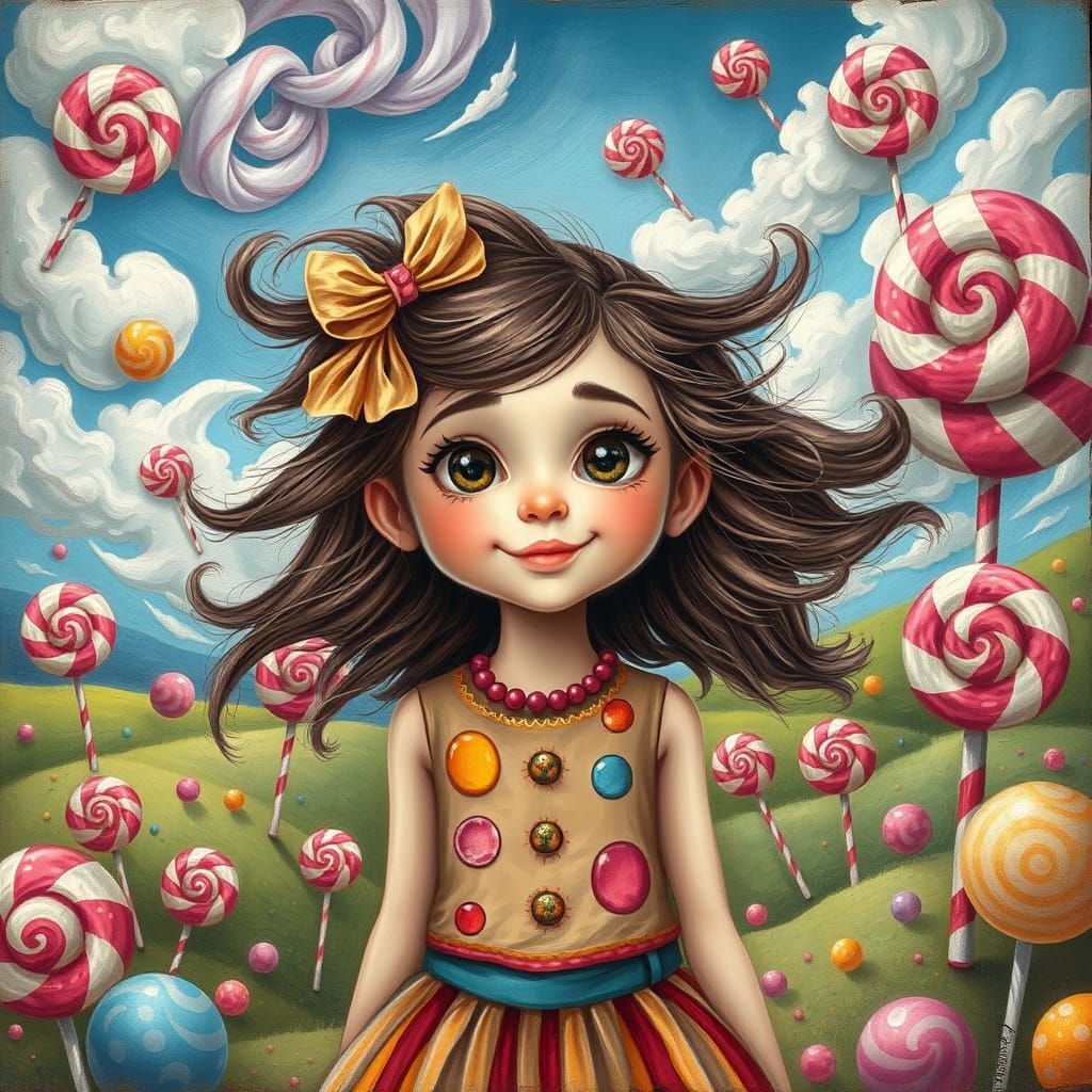 This image depicts a young girl with a wild spirit, surrounded by swirling candy-colored clouds, floating lollipops, and gumdrop trees in a fantastical Candyland-inspired wonderland, created in a highly detailed gouache-style artwork with bold brushstrokes and textures.
