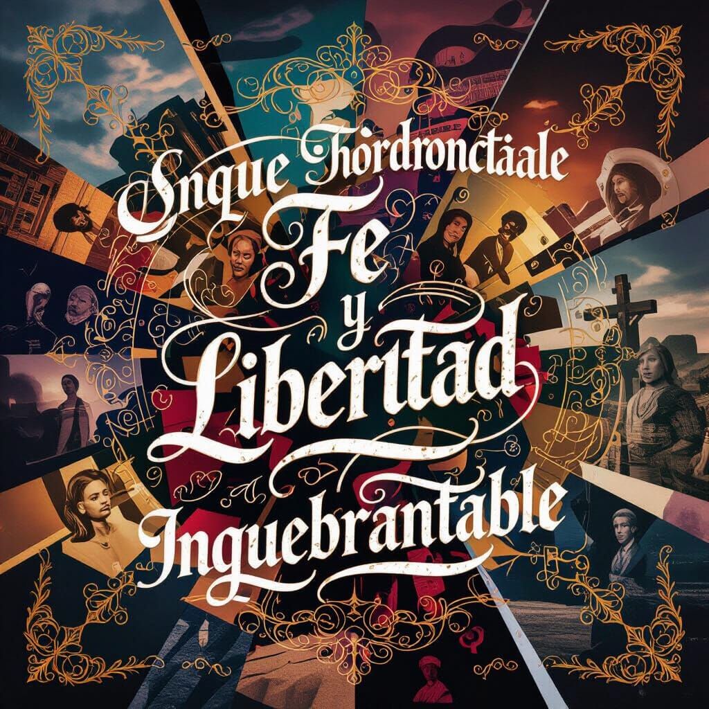 A mixed-media collage illustrating challenges to Christian faith and freedom. Features worldly distractions and symbolic elements with decorative Christian phrases, rendered with dramatic lighting and vivid colors.