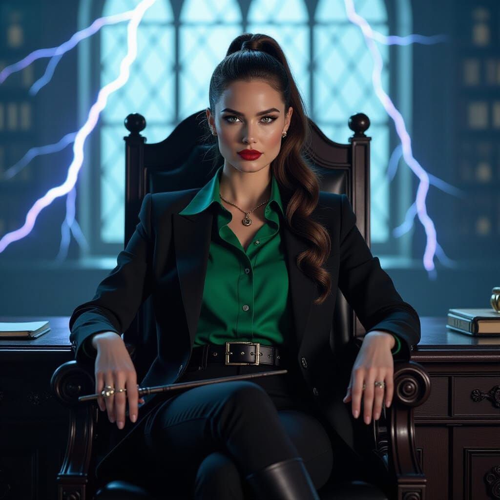 This image shows a brunette woman with hazel eyes, wearing a black suit and sitting on a throne-like chair in a magical office. The photo is hyperrealistic with dramatic lighting and cinematic effects.