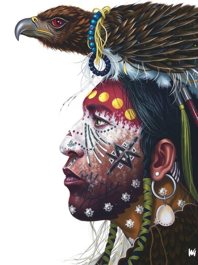 His face is not merely painted—it is a map of vision quests and spirit dreams. Golden dots crown his forehead, honoring the rising sun and the seven council fires. The black starburst across his cheek is the mark he saw in a sacred dream: a guiding constellation sent by the ancestors. Around his mouth and chin, snowflake-like shapes and thunderbird trails whisper of winter survival and storm-born strength.