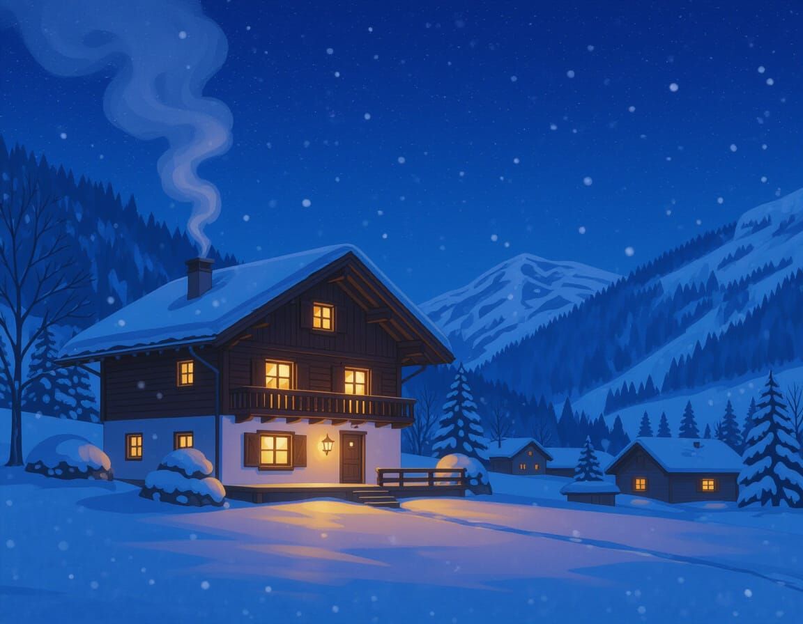 This image shows a charming anime illustration of a cozy wooden chalet in a peaceful Swiss valley. Soft, warm light emanates from the windows under a starry, snowy night sky.