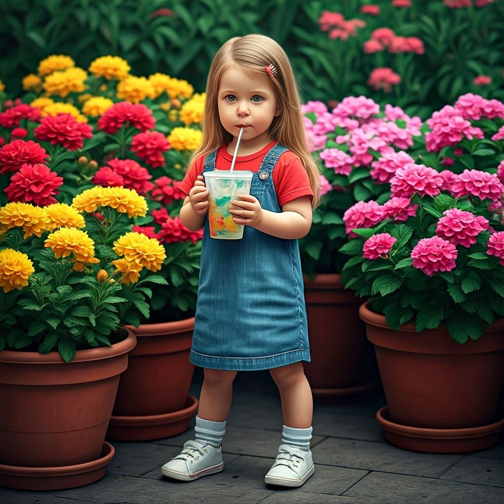 This image shows a fair-skinned, blue-eyed three-year-old girl with long blonde hair in a denim sundress, red t-shirt, short socks and white trainers, holding cups of shaved ice against colorful flower pots, rendered in a hyperrealistic style.