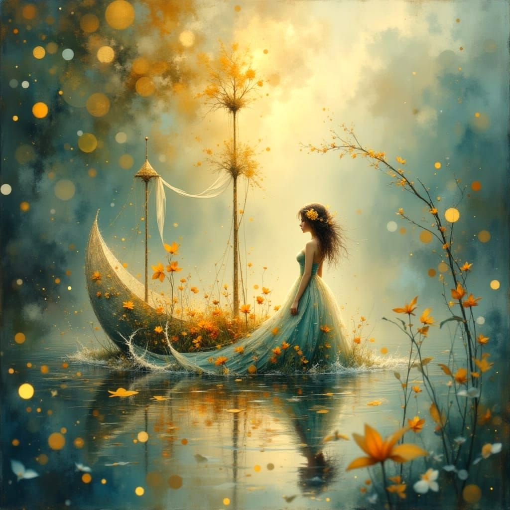 A surreal image of a boat floating on fluid, colored water. The scene is dreamlike, with soft bokeh and a whimsical, fantasy aesthetic, reminiscent of a sketch.