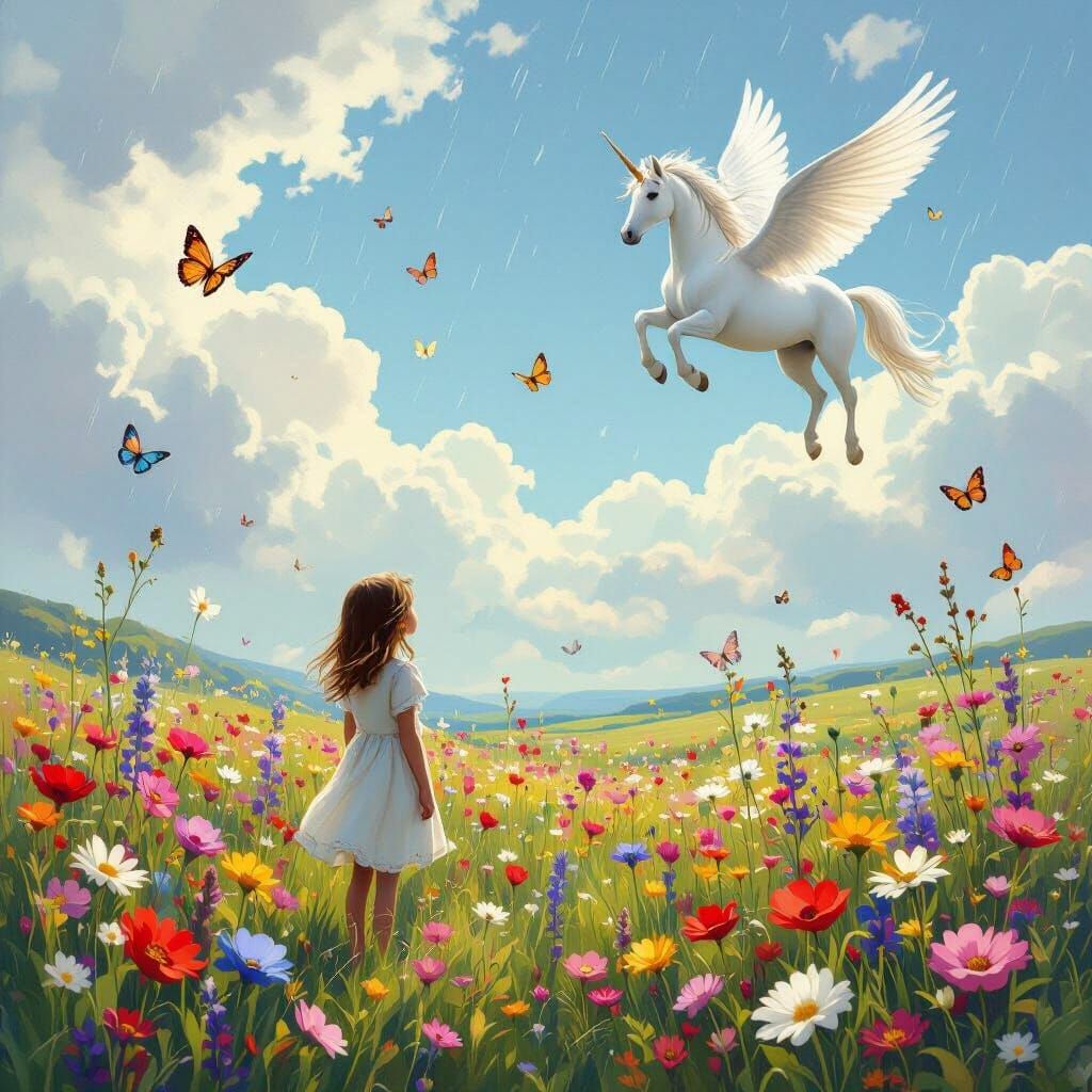 This image shows a young girl in a colorful flower meadow with light rain and butterflies. A Pegasus flies in the sky, rendered in a dreamy, painterly fantasy art style.