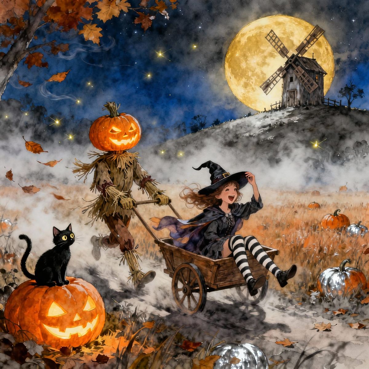 A whimsical scene of a laughing witch and a glowing scarecrow in a misty autumn field under a large moon. Painted in a dreamy watercolor fantasy style.