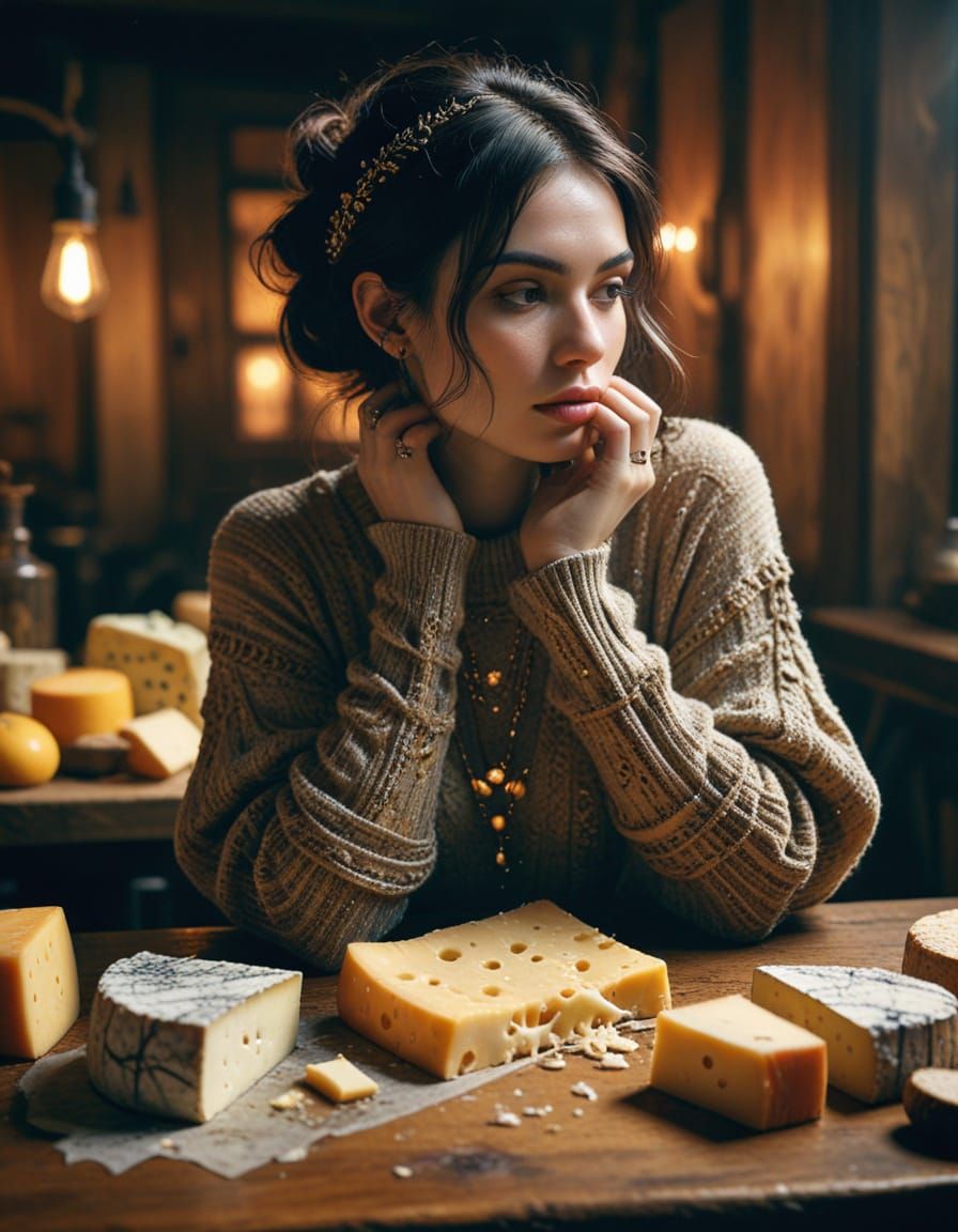 This image captures a serene moment of a person indulging in artisanal cheeses, surrounded by wheels and warmth, with a look of pure delight on their face.