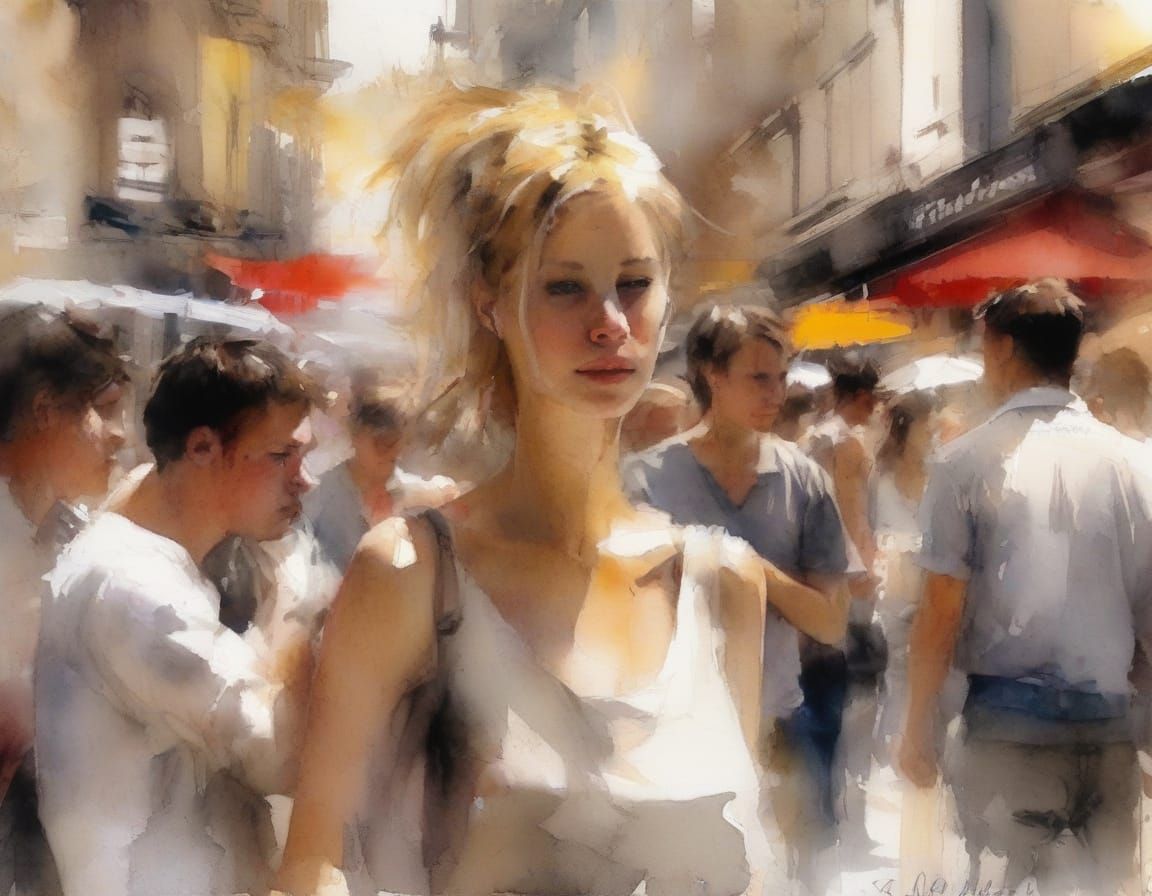 This image shows a captivating watercolour illustration of a young rebel in a bustling marketplace, with vibrant ink bleeding and soft focus background, set in a warm golden light.