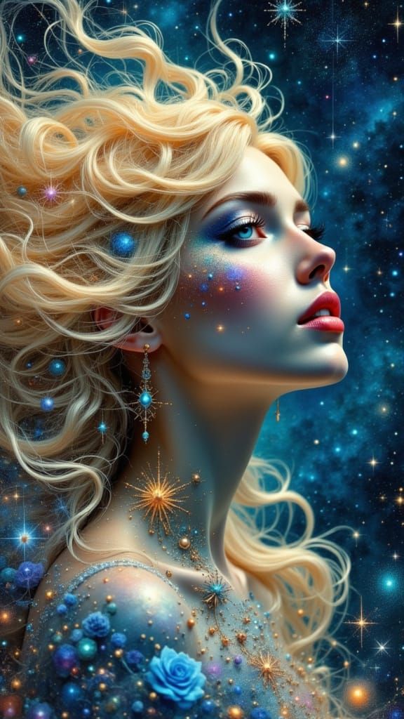 This image shows a beautiful woman with long, flowing blonde hair made of cosmic matter against a starry space background. Rendered as a luminous digital painting with vivid colors.