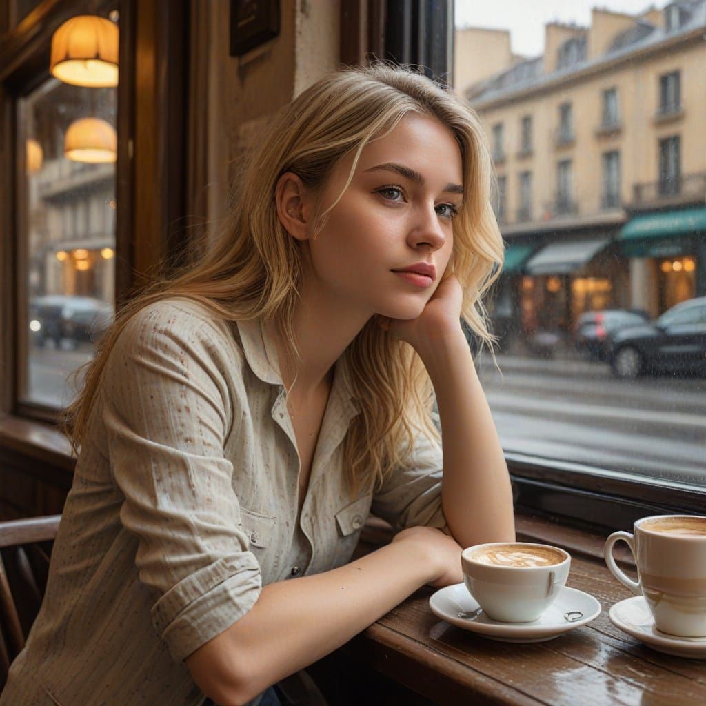 A medium shot oil painting of a young blonde woman in a vintage French cafe, drinking coffee and looking at the rainy street. The painting is reminiscent of impressionism.