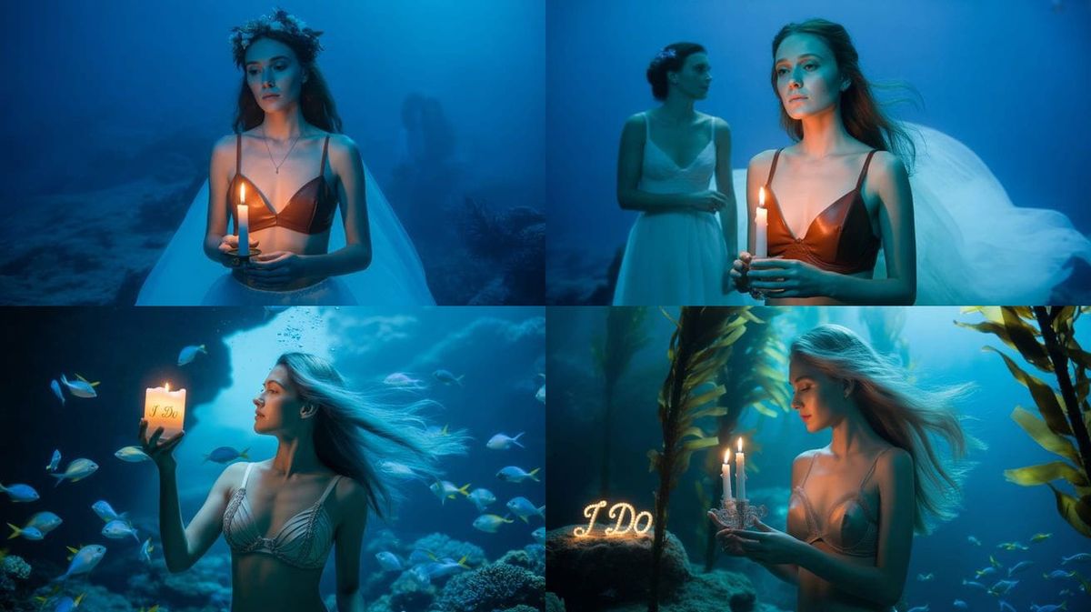 A surreal image of a woman underwater. The ethereal figure wears a leather bralette and holds a candle, evoking an unconventional underwater wedding scene. The artwork has a dreamlike quality.