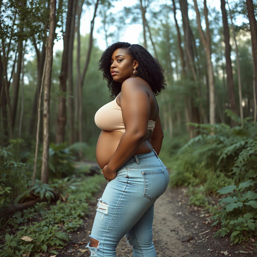 This image shows a full body portrait of a curvy, plus-size African woman in tight clothing, standing on a wooded trail. The profile view highlights her figure.
