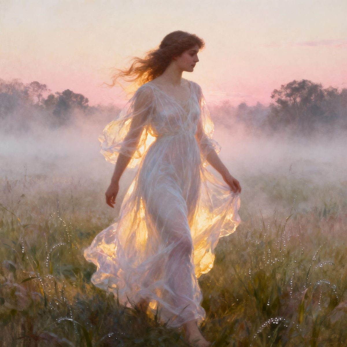 A woman in a flowing white dress walks through a misty meadow at dawn. The scene captures soft, diffused light and atmospheric depth in a romantic, painterly style.