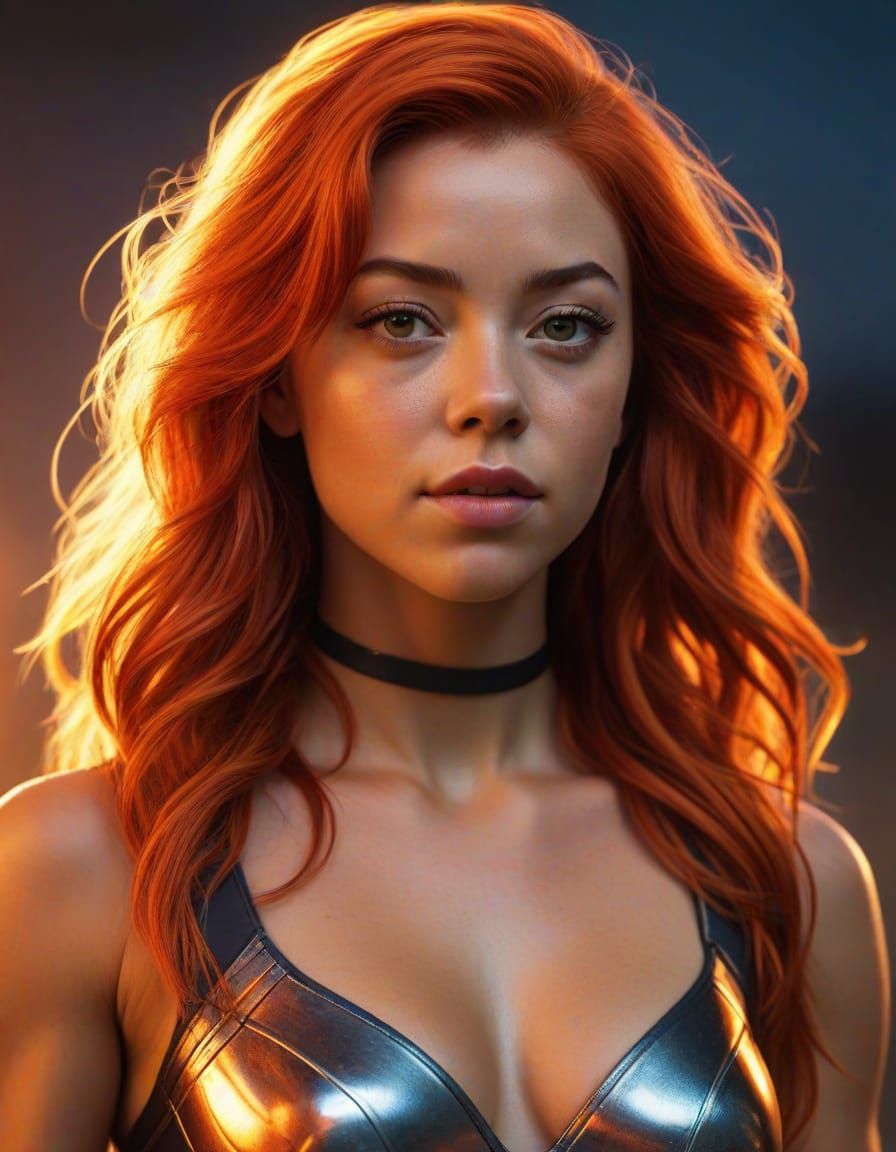 A cinematic portrait of actress Sydney Sweeney with orange skin and flaming red hair as alien princess and superheroine Starfire, from DC's Titans.