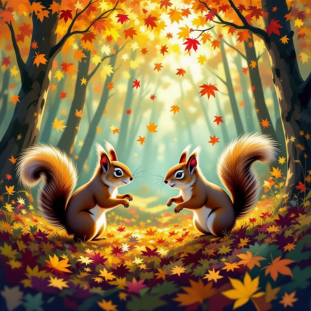 This image shows squirrels chasing through golden falling leaves in a vibrant, dreamlike forest. It features swirling patterns and luminous flora in a surreal, jewel-toned palette.