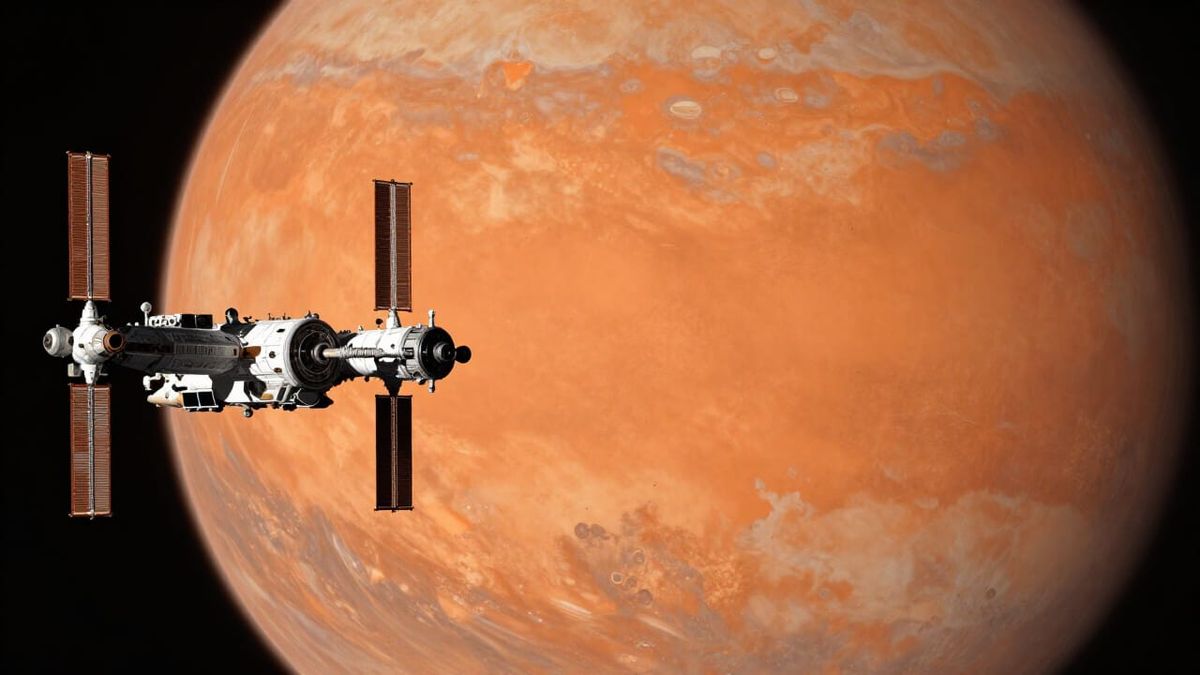 A retro-futuristic space station is positioned at the edge of space, hovering above a large planet dominated by shades of orange.