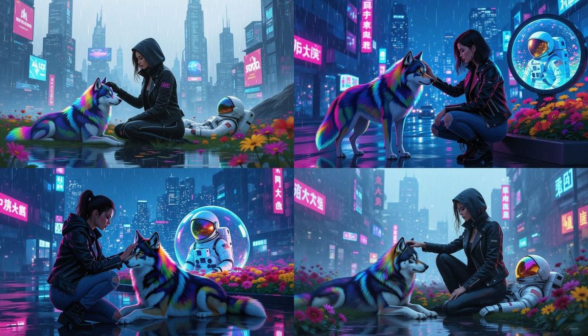 This image depicts a sci-fi heroine in a cyberpunk setting. She is shown on a rainy night, petting her colorful wolf companion in the neon-lit city, as digital art.
