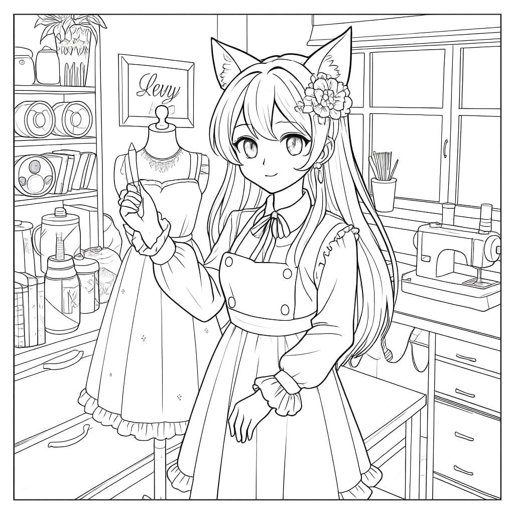 This black and white line art coloring page features a Japanese cat ear woman in a crafting room, altering a dress. Perfect for aspiring artists and fans of VTuber avatars.