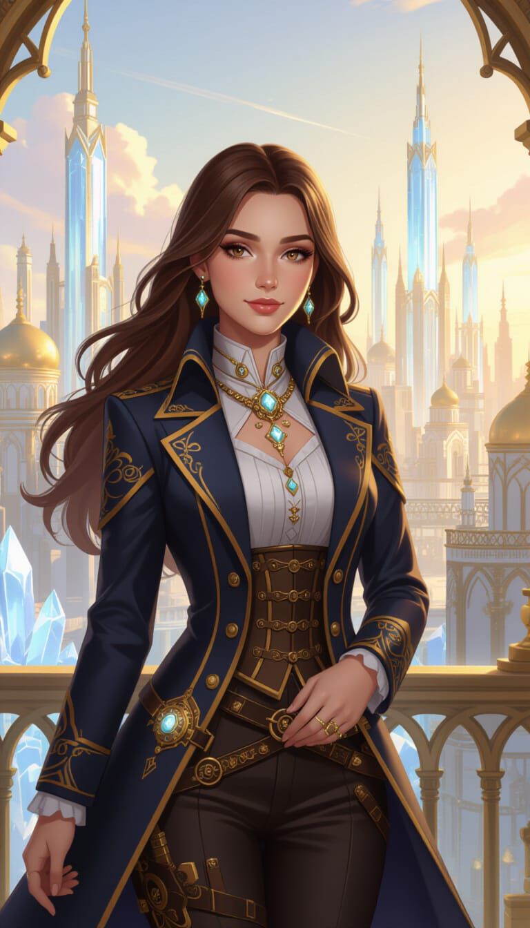 A full-body portrait of a young woman from Piltover, depicted in the distinct Arcane art style. She stands confidently amidst the gleaming architecture of the city, illuminated by warm sunlight.