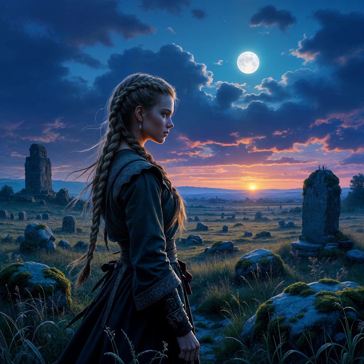 This image shows a stoic Viking maiden with braided hair in ancient fields at twilight. Moonlight illuminates mossy stones, evoking lost history and quiet strength in a detailed matte painting style.