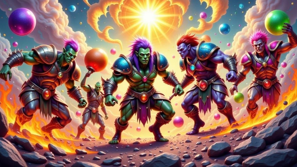 Create your own vibrant, action-packed images of orcs battling with colorful balls in a sunny setting, all for free and with ease