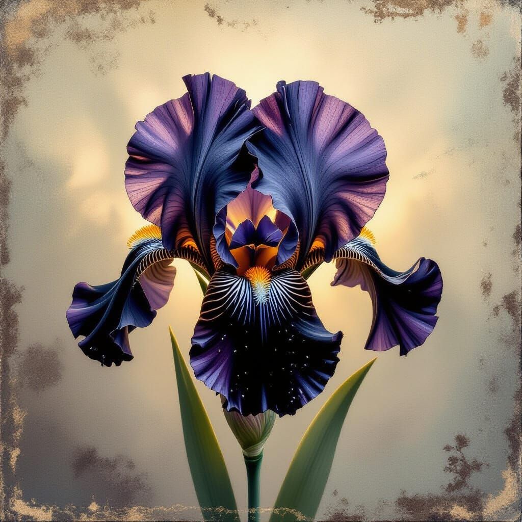 A vintage oil painting of a black iris flower with backlight and fraying edges. The artistic style evokes a sense of nostalgia with its grunge background.