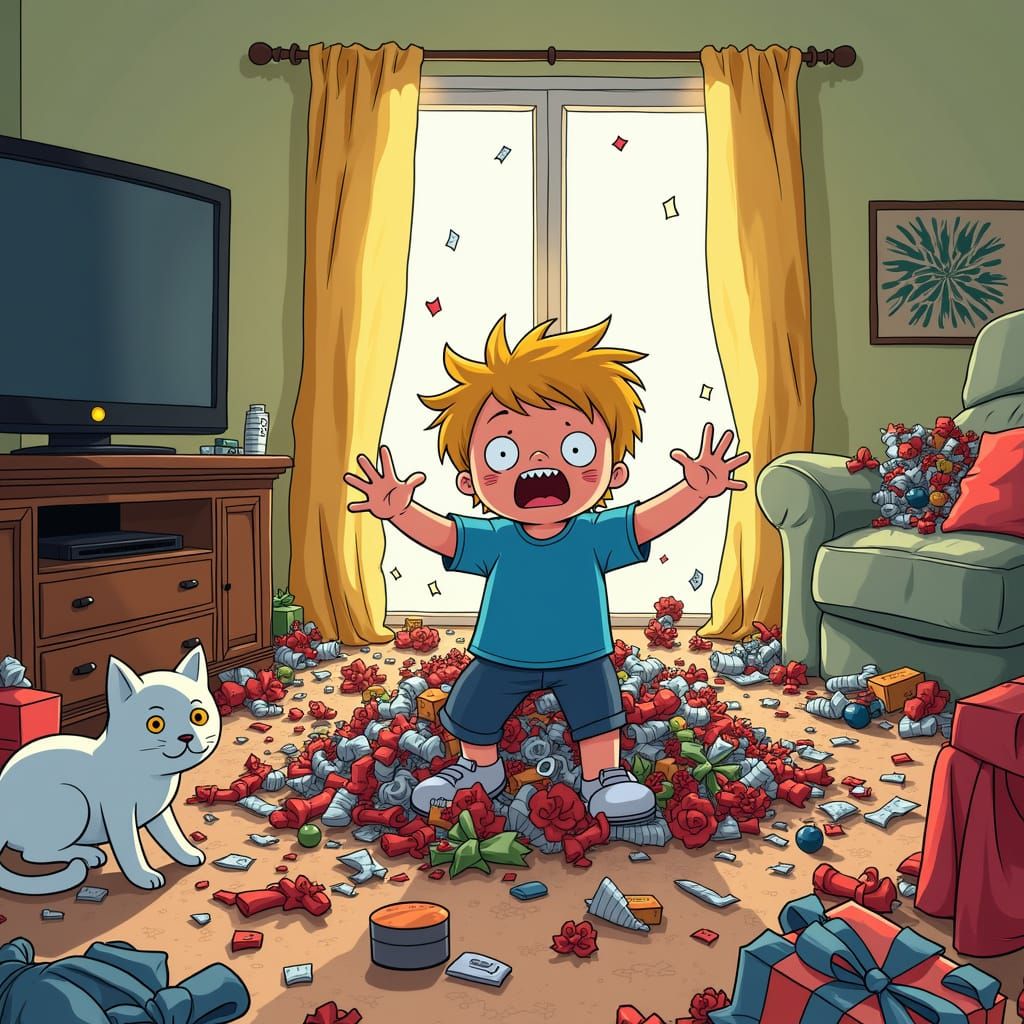 A cartoonish scene of festive chaos. A child emerges from wrapping paper, a cat covered in ribbon, and a dad with tape on his head add to the comical pandemonium in a playful cartoon style.