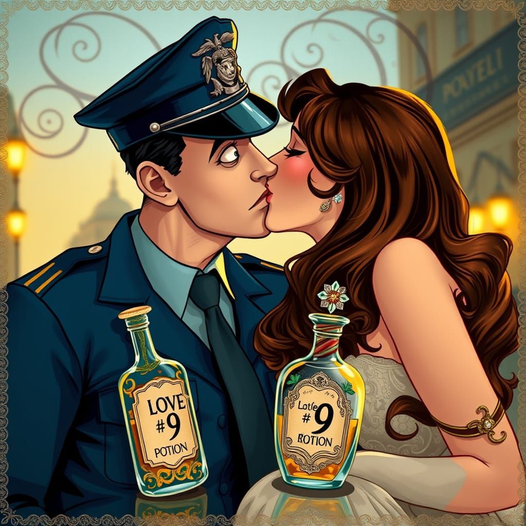 This image shows a surprised policeman in uniform caught mid-kiss, with a love potion bottle nearby. Rendered in a vibrant Art Nouveau style with swirling patterns and golden hour light.
