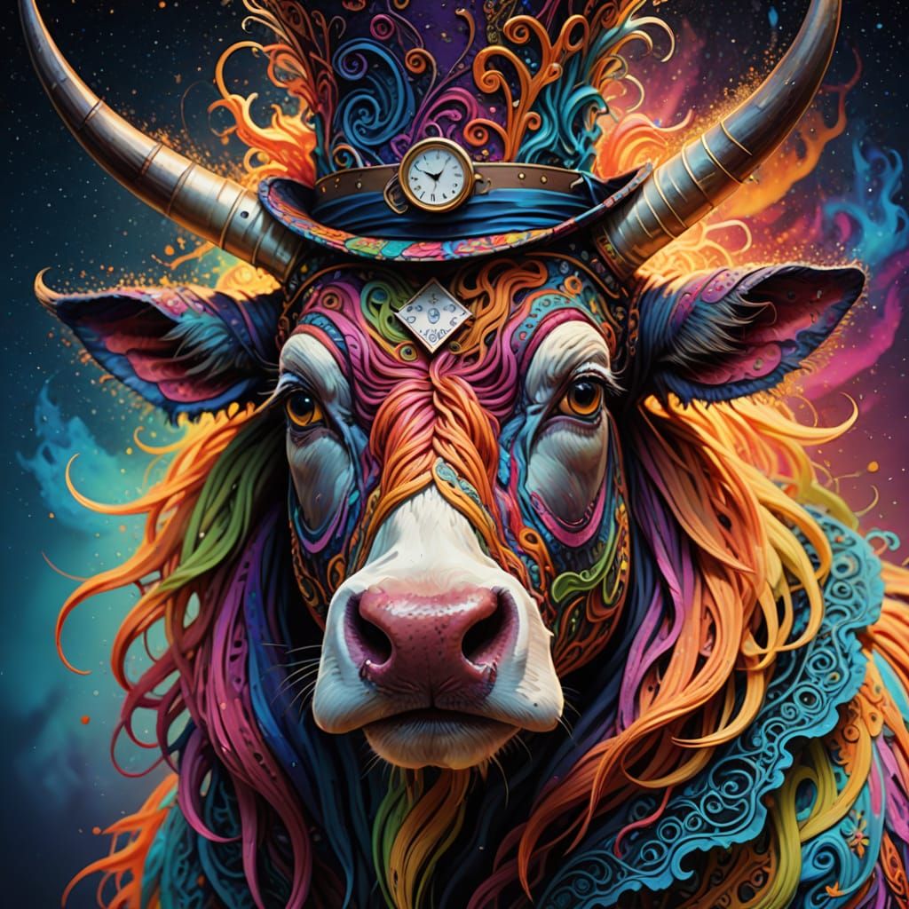 A hyperrealistic 3D rendering of a psychedelic cow with a multicolored yarn mane set against a starry sky. This dreamlike digital illustration features swirling patterns and vibrant colors.