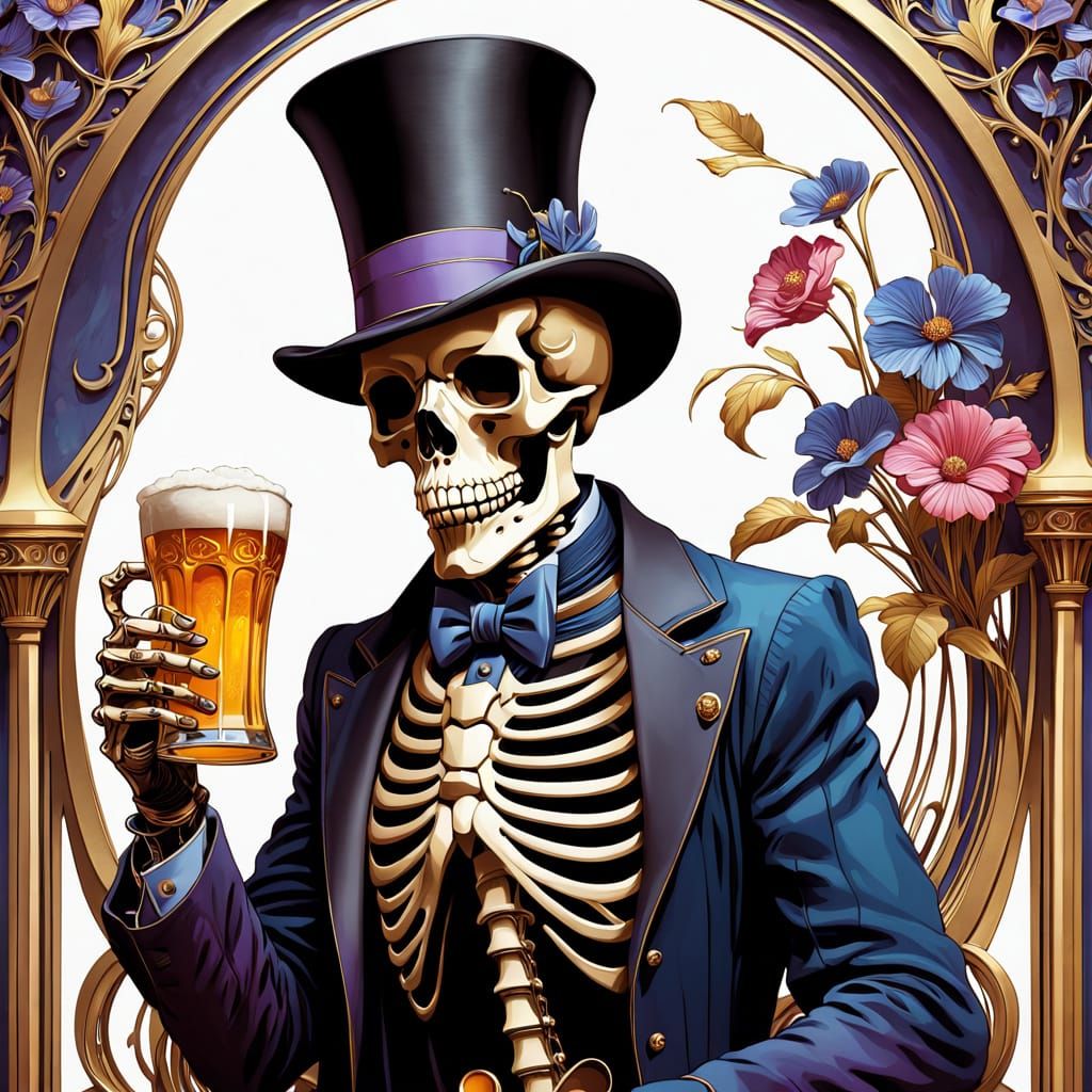 This image is a highly detailed, colorful watercolor painting in the style of Art Nouveau, featuring a skeleton in a top hat enjoying a cup of beer amidst a vibrant floral frame.