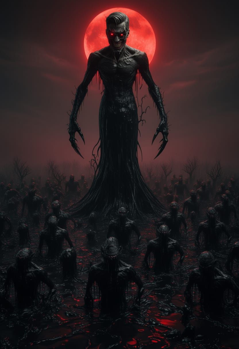 A chilling photographic horror image featuring a tall, faceless humanoid with sharp talons in a warped, inky forest. Dripping oil and dark elements create an unsettling atmosphere under a blood moon.