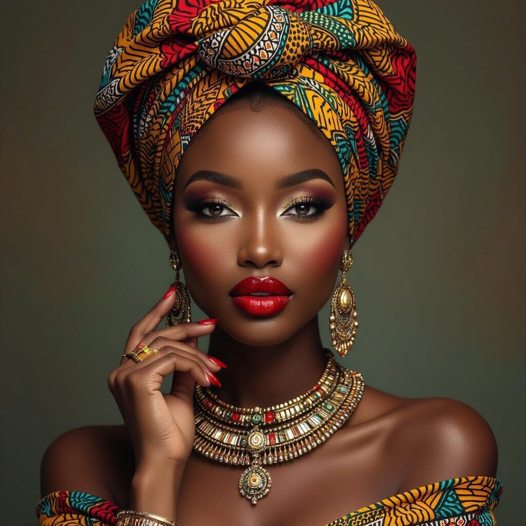 This image shows a beautiful African goddess with flawless skin and vibrant traditional attire. The hyperrealistic portrait features dramatic lighting and a rich, painterly aesthetic.