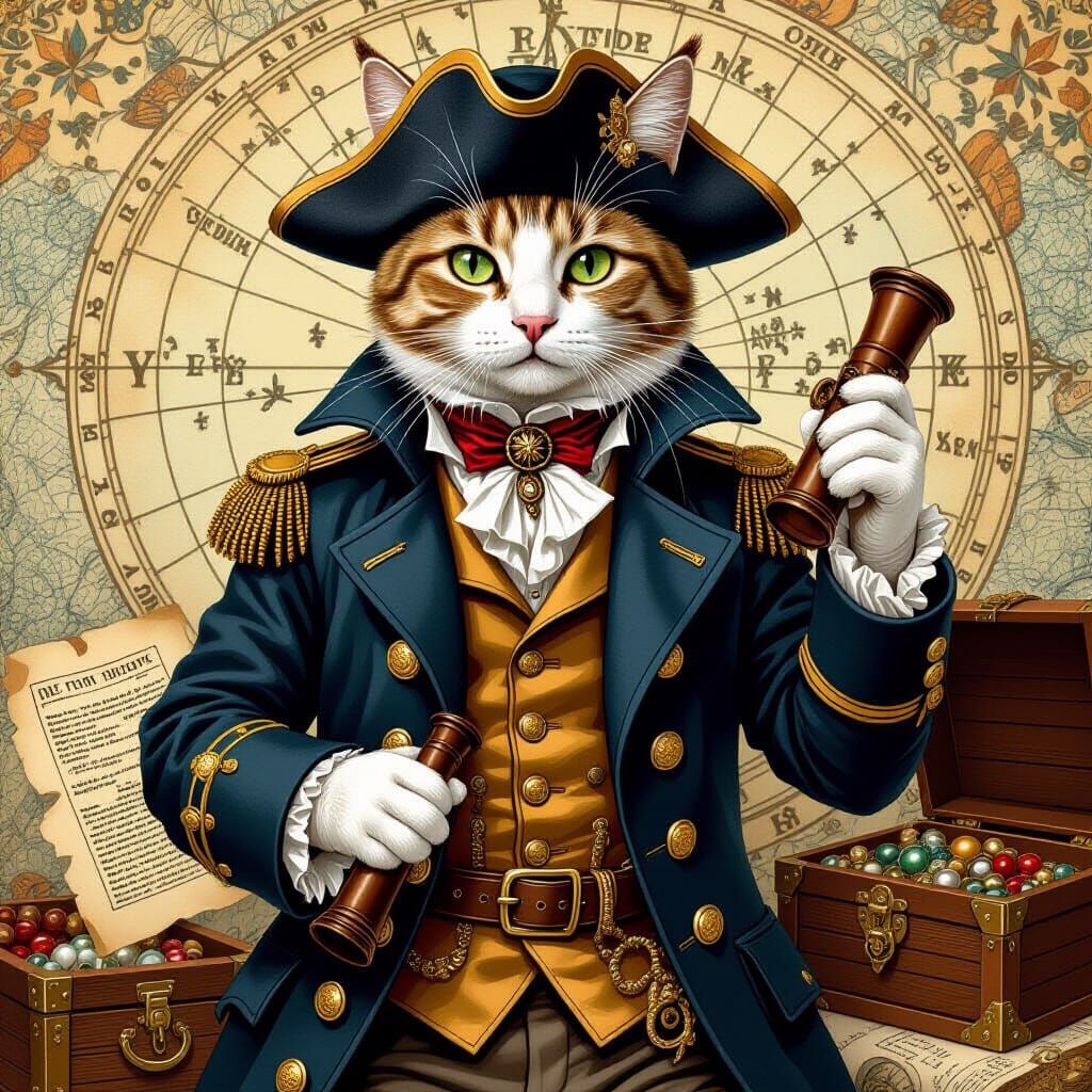 A regal cat dressed as a sea captain surveys his treasure. The feline portrait, reminiscent of classic naturalism, features rich textures and a warm, earthy color palette.