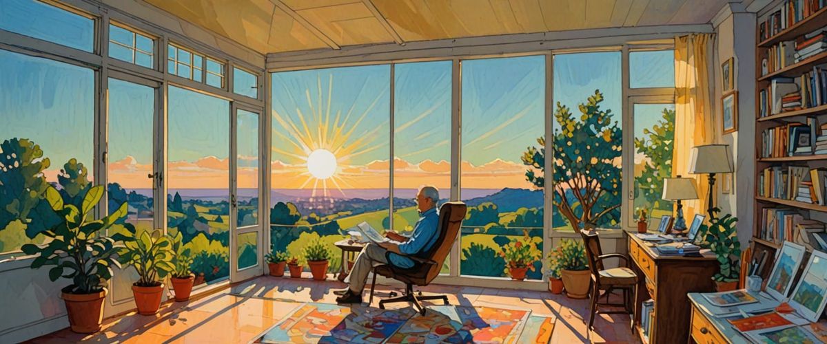 This image captures a cheerful modern art studio bathed in bright afternoon daylight. The scene is rendered with a blend of gouache and watercolor techniques, featuring dramatic chiaroscuro lighting.