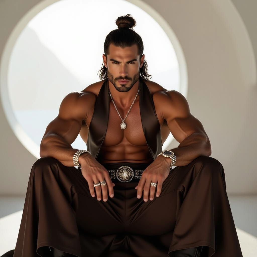 This image shows a handsome, muscular man with a long face and brown hair in a man bun, wearing a light brown silk suit and black boots. He sits in a futuristic house as snowflakes fall, bathed in divine light. The image has a clean, futuristic aesthetic.