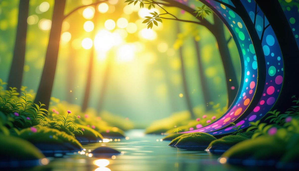 This image showcases a vibrant forest scene bathed in natural light, with soft bokeh blurring the background for a dreamy effect. Shot with a DSLR, it features sharp focus and intricate detail in a splash art style.