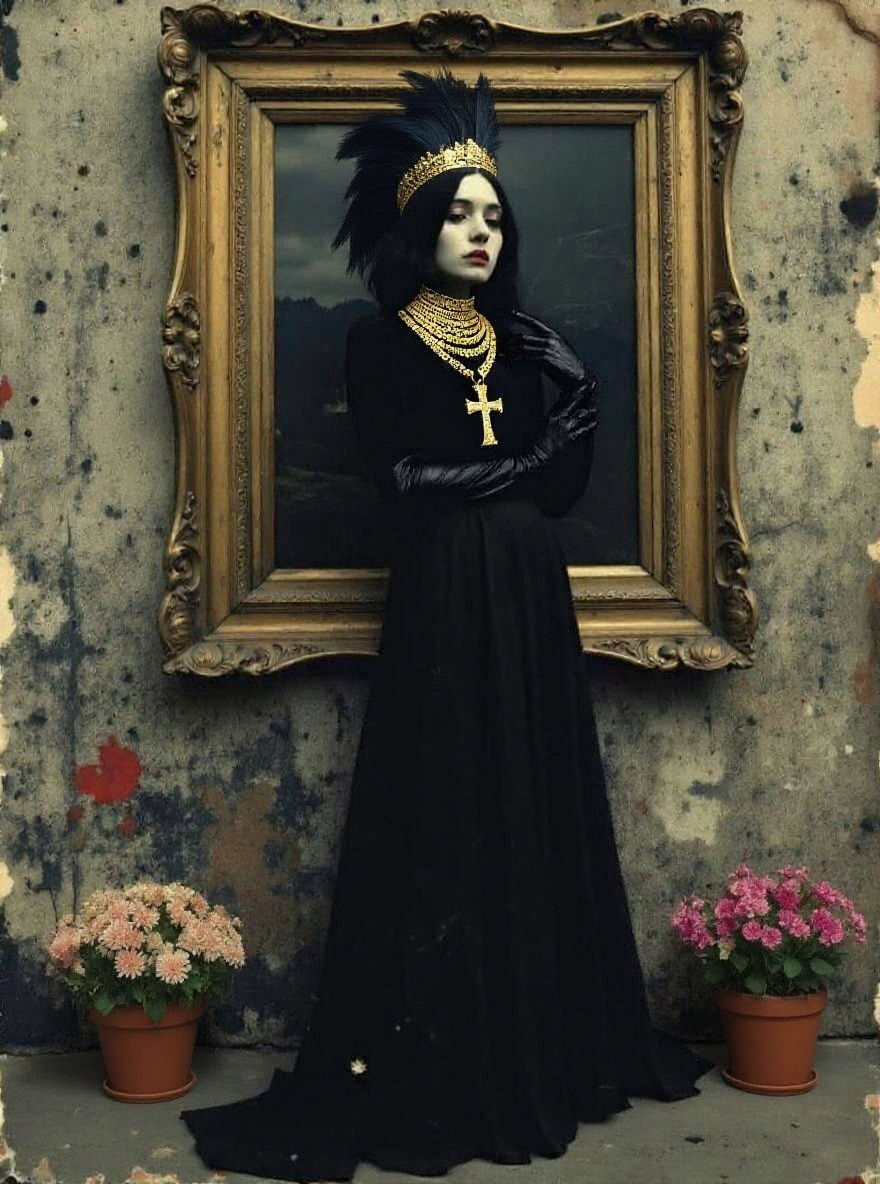 This image shows a goth girl with pale skin and dark makeup, framed in an ornate gilded frame. The background is a dark, atmospheric collage with intricate textures, in a digital collage style.