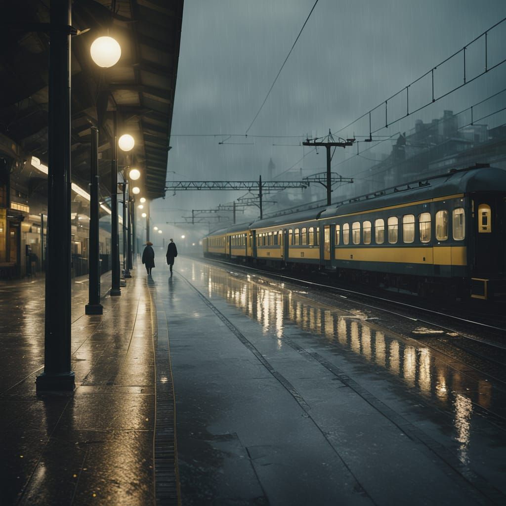 A cinematic film still capturing a train station on a gray, rainy evening. Features muted colors, dim yellow lights, and reflections on wet surfaces, creating a moody atmosphere.