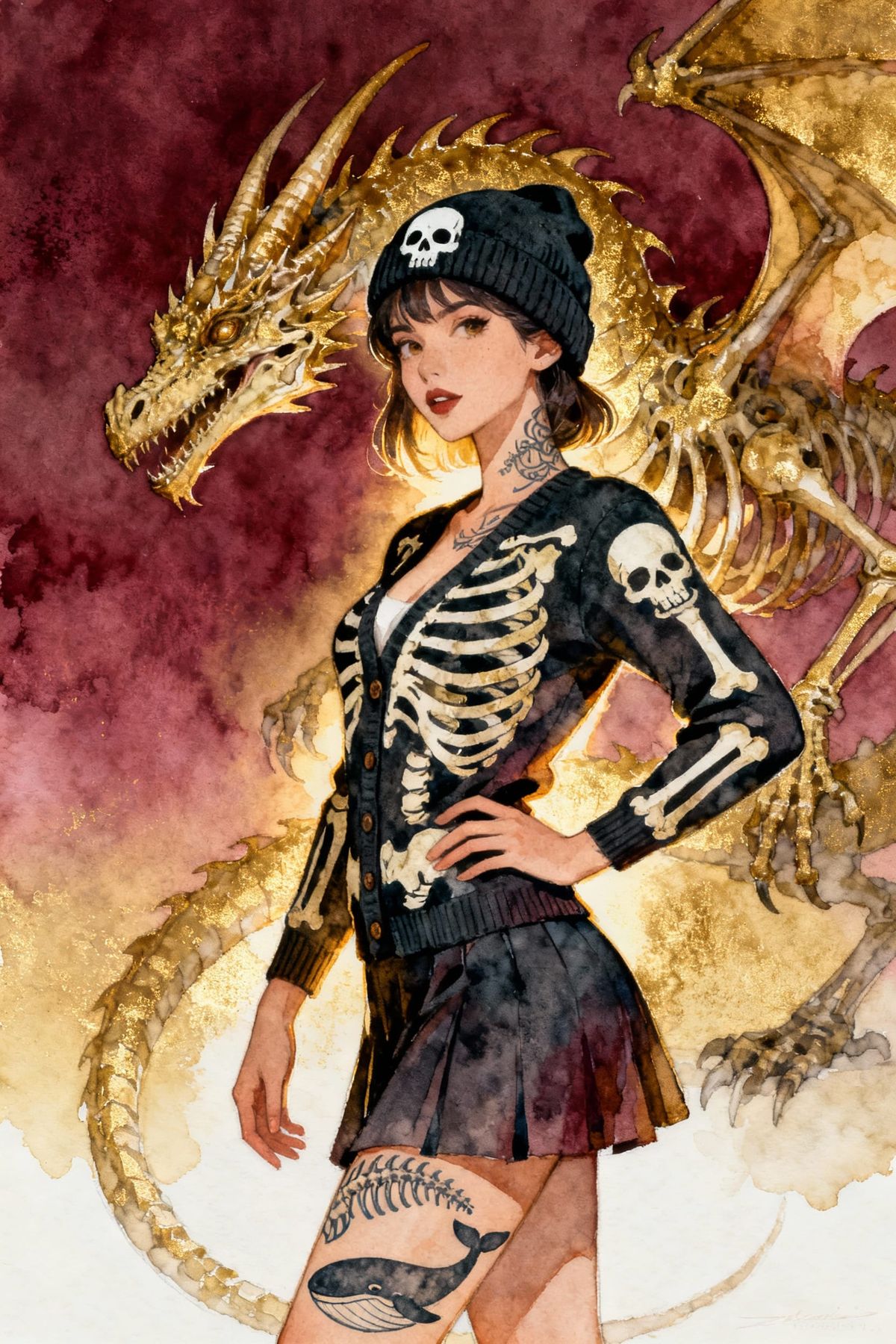 A limited-palette water-colour painting of a young woman (skeleton-pattern cardigan and skirt; skull-pattern toque; whalebone-pattern tattoos) standing in front of a dracolich. gold/maroon gradient side-lighting; intricate details; perfect anatomy; pinup style
