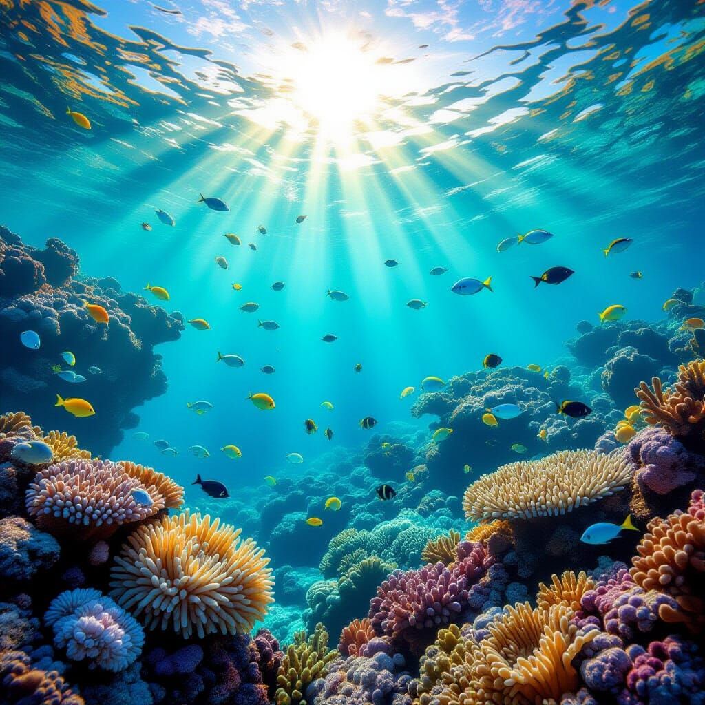 This image shows a detailed, photorealistic underwater world with a vibrant coral reef. Exotic fish swim among colorful coral formations, illuminated by dappled sunlight filtering from above.