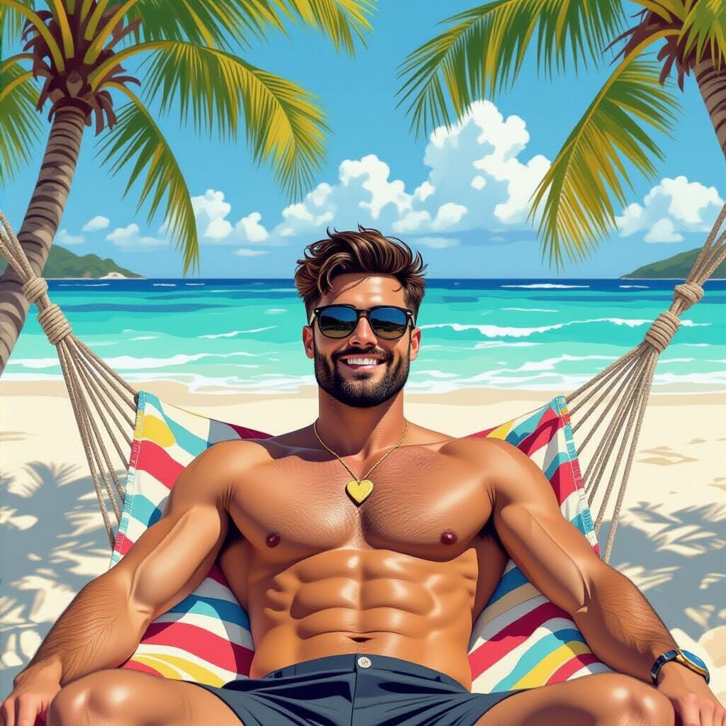 A highly detailed charcoal drawing of an athletic man relaxing in a hammock. The artwork captures a serene Caribbean beach scene with turquoise waters and vibrant hibiscus flowers, emulating expressive and textural styles.