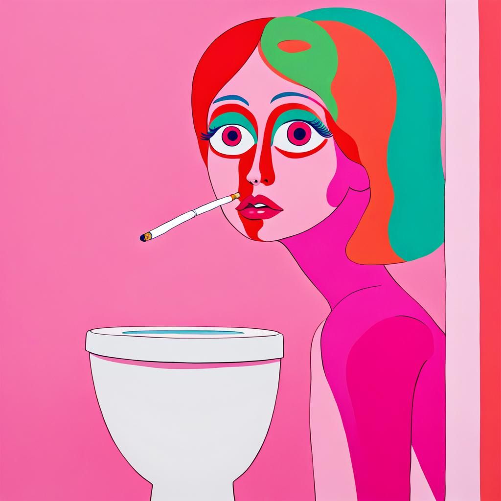 A whimsical portrait of a cartoon woman with exaggerated features. The artwork presents bold colors and dynamic shadows in a playful style reminiscent of fauvism.