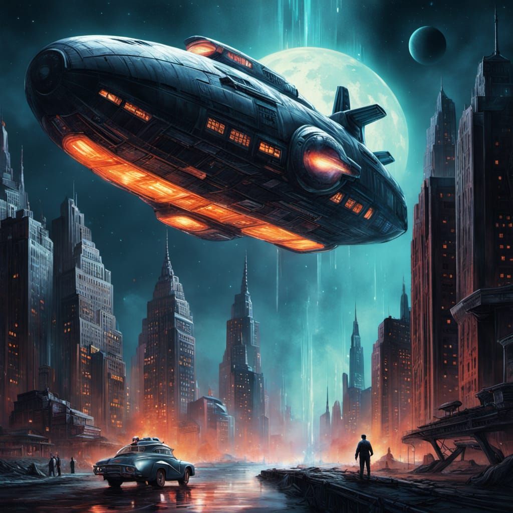 This digital matte painting depicts a vintage sci-fi book cover. A spaceship approaches a vibrant, futuristic city against a cosmic backdrop, rendered in a bold, retrofuturistic style with dynamic colors.