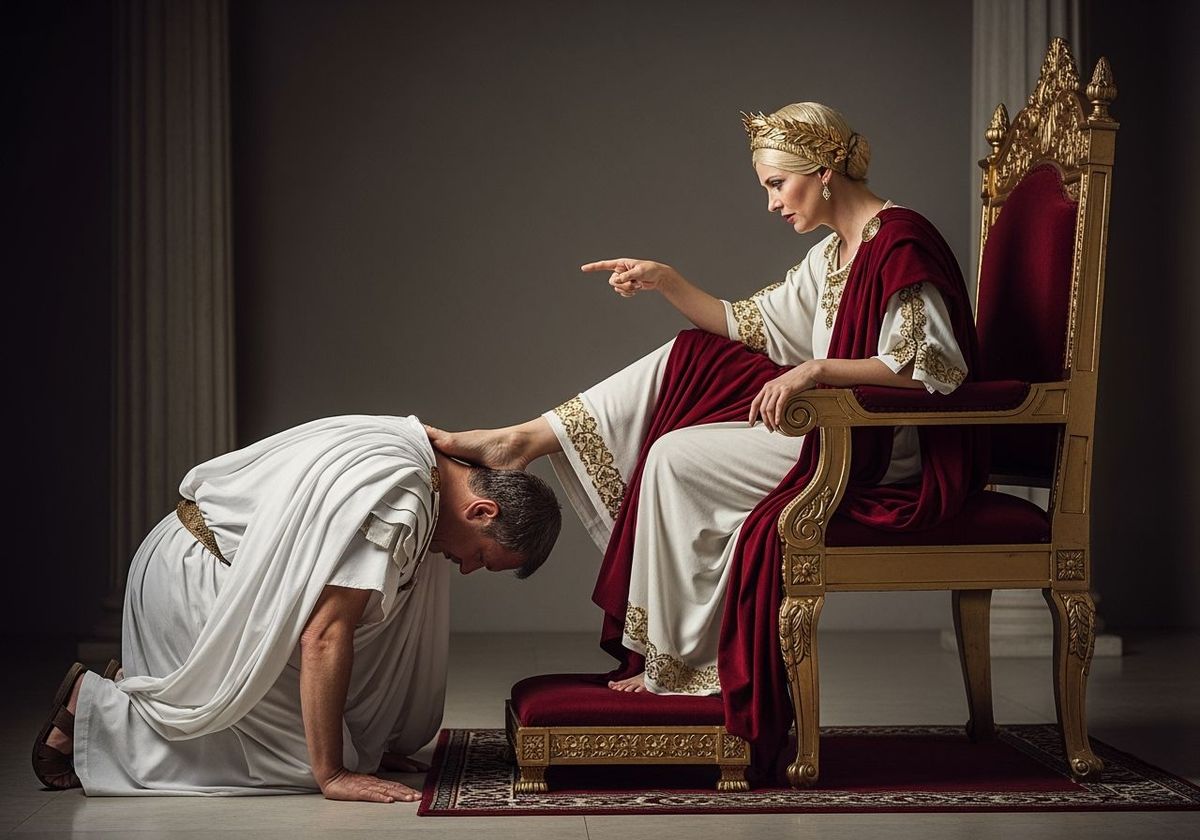 This image shows a Roman senator kneeling before a powerful Empress seated on a golden throne. The high-definition image captures a scene of imperial authority with soft, natural lighting, as if captured by professional photography.