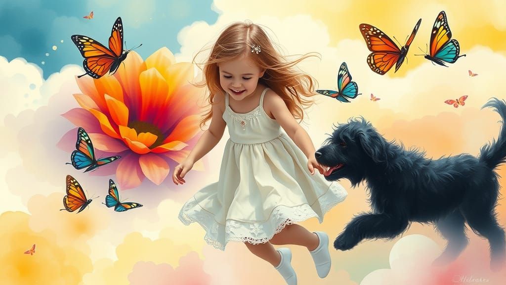 This enchanting scene shows a young girl and her black dog playing together amidst a kaleidoscope of colors, reminiscent of watercolor and abstract art, with delicate, shimmering textures and soft, ethereal light.