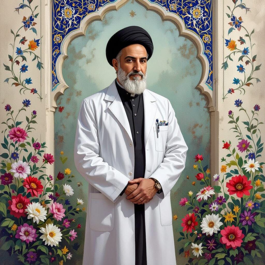 This image shows a doctor in a white coat standing in a respectful pose, with Shirazi architecture in the background. The artwork blends Iranian culture and realism in the style of Persian art.