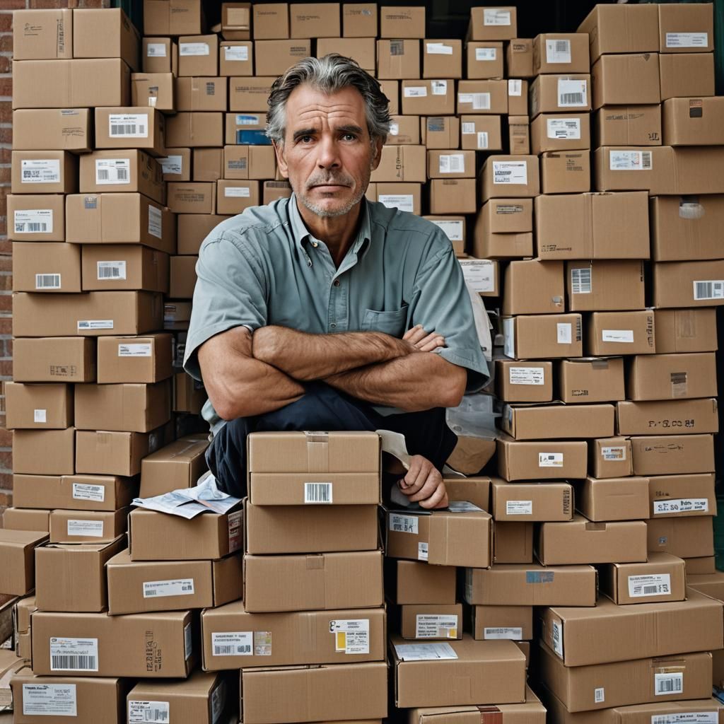 A striking portrait captures a man opening his front door to find numerous boxes. This professional photograph, with its soft lighting and sharp focus, highlights the scene's high contrast and vivid colors.