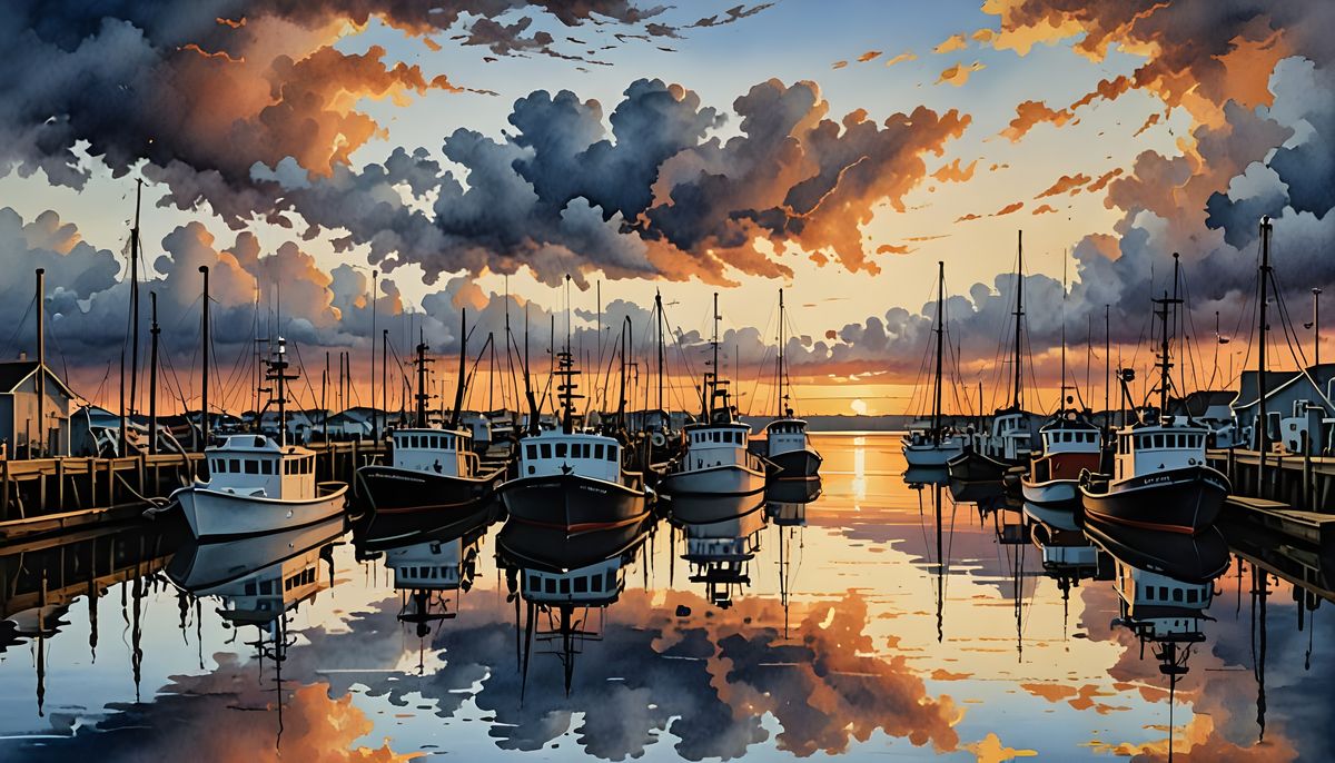 This image captures a serene marina scene at sunset, featuring silhouetted boats and a vibrant sky with realistic watercolor effects, showcasing a tranquil evening atmosphere.