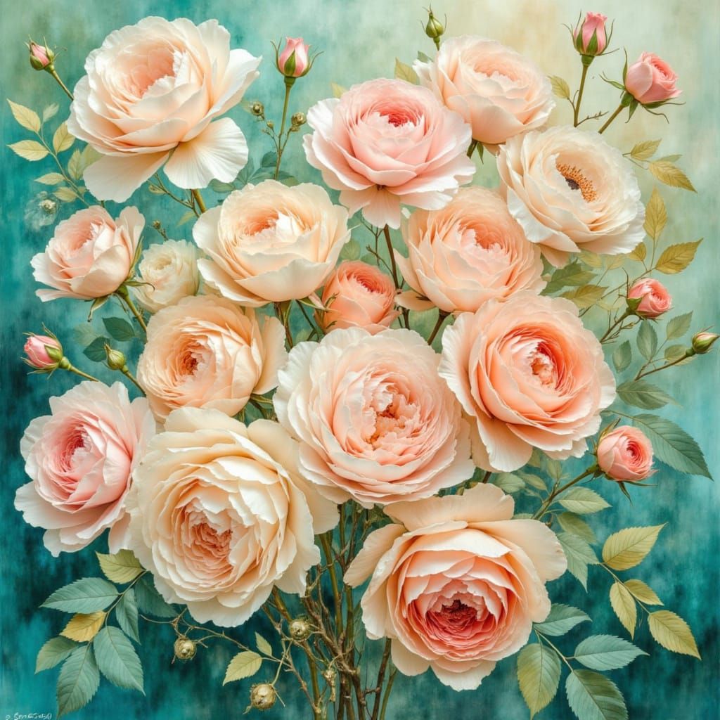A striking picture of a lavish bouquet of roses in gentle pastel shades. The composition features an impasto oil glazed layered style, with dreamy, ethereal and romantic qualities.